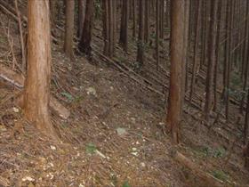 下峠まで引き返し下峠から破線道ではなく尾根を直登すれば井谷ノ峰には近いが、破線道を確認のため歩いた ![]() 破線分岐まで戻りここから井谷ノ峰に登ろうと道標を確認してコンパスを合わすが、余りにも急傾斜、見ると巻き道が有り地図から巻き道で登れそうだと地図を読んだ。 通られる方が少なそうだが、道跡はかすかに残り、この辺に地図に載る斜面道が有るだろう地点に道は有った ところが、斜面道は途中で消え適当に道に上がった ![]() 分岐には下峠側の道標が↑ 巻き道の様子 斜面道 |