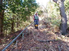 | P1279mを確定して右手の山抜け点を目で確認してルートを読む 標高1220m付近で尾根が分かれる。マッチャンの下調べによると南東のP1904mに下って波線道にでるだが、 右手の南西尾根の方が踏み跡が濃い。南西に下る。傾斜はやはり地図通り厳しい 途中で小さな岩稜、オヨヨと思うが右手から上手く巻下れた 突然前が開けた。波線道に出た。ここに林道が延びてくるのか木が倒され測量されていた その少し下に林道が延びて来ている 波線道はハッキリと有り石積なども確認できるが林道のためその先で林道に下れるか不明だ 石積付近で工事中の林道に下った。今後はモット先で下れるだろうか?それとも尾根先まで林道が延びるのだろうか??? 林道から寒峰が見えた。 |