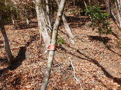高尾山から東は踏み後は薄く行く人が少ないのだろう それでも炭波線道は測量され測量杭があり、小さなブッシュも安心だ P930 、を確定してP884を確定する。国土地理院地図はここまで炭波線が載る。 尾根が続いている。岩上峠まで道が有ったはずと踏み後を探る。 予想通り道は測量され測量杭がある。それでも慎重にコンパスで尾根角度を取りながら歩いた 途中で一ヶ所登山者だろうかテープが見られた。同じコースを歩いた方だろう |