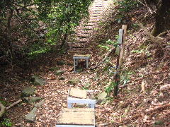 | 八王子社跡に久しぶりに下るが途中にできた新道にテープが誘導されていた 古道はあまり人が通らないようだ。登りは古道の方が登りよいだろう ![]() 八王子社跡 ![]() |