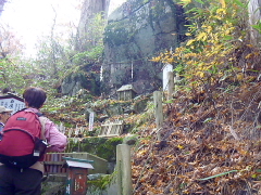 | 社務所前から金剛山遊歩道を千早園地に歩く、金剛山遊歩道は初めて歩くコースだ 紅葉は綺麗で、途中の外れに文殊様が祀られた大岩があり信仰が厚いようだ。チョット、痴呆が出ない御願いをしておいた 汗 |