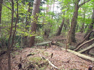 サア。バリエーションルートの尾根先の確認をし、尾根に取り付く、初手から植林内のナカナカの急登 この尾根を捲くようにルートがあるらしいがショウタン達には分からない。ショウタン達は直登だ 少し登って小休止していると西下に車が見えた アレー、父鬼から伸びる林道終点がそこまで来ているようだ。山と高原地図にも記載されていた。 古い道標があったが無視して直登 尾根を登って行くと踏み後があり小枝が払われルートが現れた 後は説明のしようが無い、地図尾根通り千本杉を目指す。コースは踏み後があり分かりよい 又地図と照らし合わせても地形がハッキリと現れ地図読みも楽しい 途中P540m付近で巻き道が続き直登より良いと判断巻き道を進んで 途中で分岐もあるが、この付近はテープが現れ踏み後もハッキリとある どうやら、尾根下の道標の続きのようだ ![]() 千本杉付近の尾根に出て尾根を東にブッシュを分けると桧原越えにでた ここまでのコース略図 ![]() |