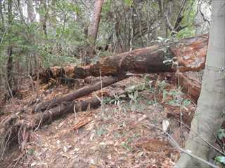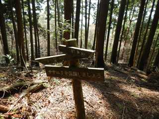 | ダイトレ側に沿って踏跡を下るが、道は良い と、写真の不動山巨石の道標が出た。?? そんなのは知らない。 あんな小さな山だ直ぐに見つかるさと、不動山に引き返し、付近の尾根を1時間もウロウロと探したが無い その足跡を、点線で示した。 ![]() よくよく地図を見ると、どうやら杉尾集落付近に有るのだろうとその探索を諦めた。 エアリアマップにソレが載っている様だと相棒が言うがソレを持ち合わせていない 又、行く機会を作ろうと、諦めて行者杉に向かう。 ただで行者杉に向かう二人ではない。725mピークに何か無いかと、ピークに登る。何も無いピークだった ダイトレを、行者杉に向かい、不動山からの出合いにも、不動山巨石の道標が出るが、何処にあるかはこれでは分からない ![]() |