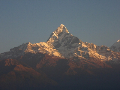 昨夜、マンシン、カリプーンと、ガンドリンGhandaungのウラミラUrmila Dalaiに、前回のABCトレッキング時に写した写真を届けるのと、もう一度ABCをトレッキングする話しがまとまった。話しの中で、マンシンが明日日本人のワンディ観光のガイドをする話を聞き、早朝にサランコット Saranbkotに行くことにした。5時にタクシーを予約、5時過ぎにYADの前でタクシーを待っていた。タクシーが来ない。マンシンに電話すると来るという。10分、20分・・タクシーが来ない。暗い中で座り込んでいると、早朝に仕事に行く女性がどうしたの訪ねてくれる。タクシーと言うとOKと立ち去る。又若者が訪ねてくれる。OKと立ち去る。ネパールの方達は親切だ。30分遅れてタクシーが来た。ネパールタイムだ。ソーリー、コレですべて解決。タクシーはサランコットに向かう。マンシンさんも来ていた。マンシンさんのグループの山名案内を手伝った。今日のアンナプルナヒマールはマタマタ美しい。