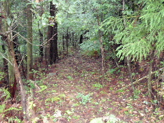 | 三角点から小道に向かう 昔はこの道も、年一度の道普請で整備されていたとか、今も少しは抜けかけた所があったが、ルンルン P724m付近で地図と道はずれているが、私は724mピークを越えた 踏み跡は無いが、測量テープがわずかに残っていた |