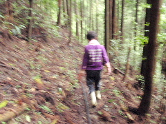 | 下山はバリエーションで向瀬谷口に尾根下山を予定していたが、間伐材と小木ブッシュ 小雨もガスもある。安全ルートで下ろうと、龍集落に下山した 下山尾根は緩やかだが下り口は別尾根に入りやすい尾根だった。おまけに下山最初は間伐材がゴロゴロ、どこかに良いコースがあるのだろうか 間伐材を乗り越えて行くと、テレビケーブルが埋められた小道に出た ルンルン下りだ この尾は細尾と呼ぶことを後で知る 予定下り尾根はブッシュ 細尾を探る |