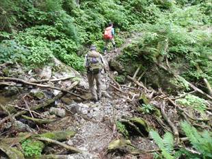| 五番関前から道標に従って在来道の道を道標に従って百丁茶屋跡に向かう 単純な巻き道だが、巻き道は谷部分で小さく抜けたり、水が流れたり、丸木橋が有ったりとなかなか厳しい 大峰奥駈道の修験の道だ ![]() 五番関まで登るに花は少なく、情報は外れていないかとドキドキのショウタンだったが、これほどの大群生が有ろうとは ![]() ほのかに匂う可憐な香りに薄紫の花は誰もが立ち止まりカメラを向けるだろう 最初に出た群生は、ここだけだろうかと急傾斜を降りてカメラを向けたが 次々に出る群生は、大群生と言うほかは無い ![]() 道上に、道下にと群生が続く どこまで有るのだろうと思うが、やはりだんだんとその数を減らす 気が付けば、在来道はそれなりに厳しい修験の道だ。蔵王権現堂から山上ヶ岳を修験する山伏たちの下りルートだ ただ、崩れた橋や山抜けした所は小さく手が加えられていた ![]() ![]() |