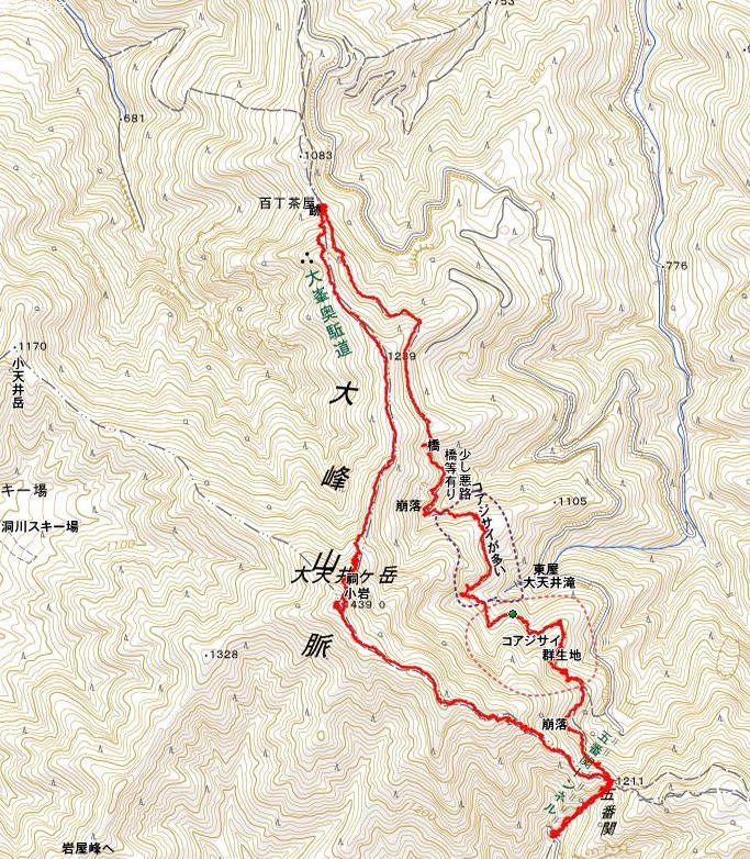 | 大峰奥駈道と書かれたコースを大天井岳に向かう いきなりの急登だ (注意 水場方面、在来道、大天井岳山頂と三方向に道は分岐する。注意がいるだろう) ![]() 途中のフラットは優しいが、最初と最後が厳しい山頂越えルート 特にモノレールが出てからは小岩が出たりルートが??と成ったりと汗を流す 途中の祠からの見晴らしは素晴らしい。山座同定で休憩だ ![]() ![]() 道標で山頂方面に登れば、木が大きくなり見晴らしは無い 三等三角点、点名、大天井は、1439、0mです ![]() |