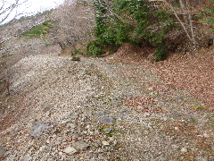 壊れた橋桁↑ 林道に出る道↑ 林道の龍神街道登山口 渡渉は簡単に出来るが、正面の流木は凄かった 右手に壊れた橋桁が有る。 その下付近から林道に登る道が有るが、相当古い整備跡だ 林道に飛び出すと、城ヶ森の登山道案内、掘割り状の右手上に、祠がある 下山は林道通り歩いた ここも台風の影響で荒れていた。 龍神街道登山口から1000m程度で、福井橋に出る 福井橋の横に付近の滝の案内があった 五段の滝、2.4km 銚子の滝4.4km さがりの滝6.1km 又春先にハイキングで歩くのも良いだろうと、写真に納めた この県道19号線は12号15号台風で荒れている 途中で河原に道が造られていた |