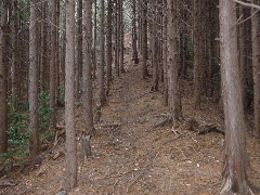 | 三里が峰に登ると尾根は植林帯で、歩きよい 逆回りで、私の上り尾根を下山する場合は、写真のマークから下ればいいだろう ↑標識番号 10230 |