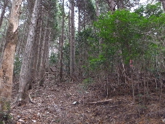| 古道に出会うが、蝙蝠岩らしい物がない、 ?? ウン もう少し東なのかな、下山は古道としている。帰りに出るだろうと、少し急登な尾根をそのまま登るが、古道より上は道整備がない。地図で見るより急傾斜、途中から雑木帯に入り、木を掴んで登ったが、別に危険を感じる所ではない 尾根に取付く↑ 古道に出会う ↑ 急傾斜を登る↑ |