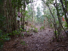 | ここで古道に下るのも良いが、尾根を少しでも長くと、P706mまで歩き、境界尾根を古道まで下るが、ややブッシュと尾根に岩稜が出て、山肌をクネクネと下った 古道は完璧で東側からの道は整備されているようだった それもそのはず、小さな谷横に立派な鳥居の持つ社が祀られていた |