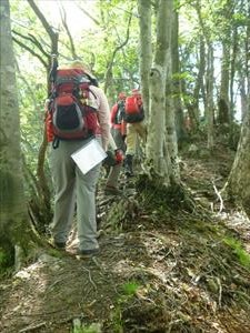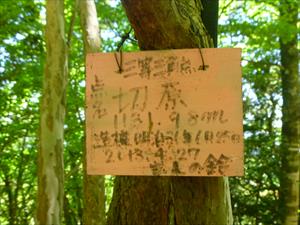 ショウジ山から三角点切原に向かう 途中で尾根が伐採倒木で通れない状態で、ソマ道風の濃い踏み跡に入る 977m付近は二重尾根で、ショウタンは右手の細尾根が近いだろうと勝手に細尾根に入った にらんだ通り尾根は右手が主尾根です 激のぼりの小ピークが出てこれを左手から巻いた 其の先で自然林のピークに登れば、そこが三角点切原が乗るピークだ ![]() ここにも宝来の鈴さんの点名板が有り、この人は何処にでも行っているのだと驚く仲間 少し点の記を補足しよう 北緯 34°16′24″.1808東経 136°02′57″.2643 標高 1131.92 ![]() 所在地は吉野郡川上村大字神の谷字桐原、俗称切原、(小字が山名という定説から、桐原山と言った所か) |