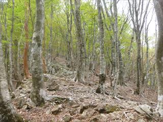 ![]() 大峯奥駈道を200m程度弥山に向かって歩くと、笹の中に上北山村の古い道標が木に立てかけられ、踏み跡を小ピークに登ると小谷林道の道標が有り、尾根を南東に下ります。踏み跡が有りますが、ガスが出ればシッカリとコンパスを取ろう。ちょっとした事で支尾根に迷い込むのがこのコースです。下りきれば、自然林は美しく、四季四季に見せる美しさはこの付近では最高でしょう ![]() 三人で抱える巨大な栂やブナ、落葉樹の森は芽吹きが進み最高の景色でした 正面にすこし大きな岩稜のピークが出ると、そこが1418mの三本栂への分岐ですが、ピークを右手から巻、高塚山に向かいます。 此処の道標は、三本栂の方向、小谷林道に誘います。小さなテープに書かれた高塚山方向の尾根に乗ります。 1418mピークから高塚山までは少し痩せた細尾根で小さな岩を巻いたり超えたりしますが、初心者OKのコースでしょう 1418mピーク右肩の道標 |
