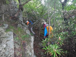 | 主尾根のタチクラ尾まで標高差200m、健脚ならあっと言う間の時間だが、急げば落石が怖い 慎重に登った。主尾根から降る場合は注意がいる。マークなどはないが、古いワイヤーが切り株に巻かれていた ![]() タチクラ尾そのものは危険なところはない。小さな岩や石楠花ブッシュらしい所は有るが、大きなショウタンでも肩に石楠花が触れる程度 ただ、タチクラ尾根を下るときは慎重に下山ポイントを取らないと大変な事になるだろう 金網ネットや岩稜で尾根先のR309には下れない部分が99%、自然な状態は今回の取り付き部分だけだ。 タチクラ尾根の状態 ![]() ![]() ![]() ![]() ![]() ![]() |