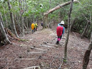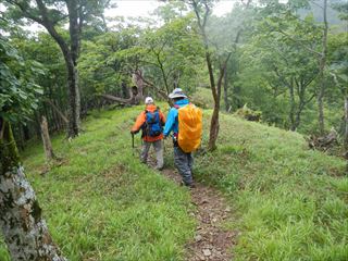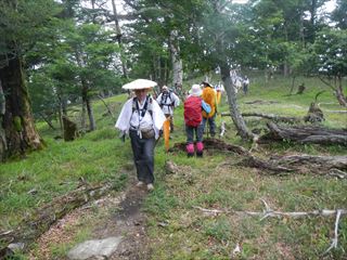 | 北風が強く、下界は35度なんて騒いでいるが涼しい。 S子ちゃんを先頭に清名ノ尾へと下る。最初は急坂だが直ぐに歩き良い尾根に成る ![]() ![]() ![]() 仲がいいのか悪いのか、ヒメシャラと檜がその勢力を競う姿は、大峰の奥深さを物語っている |