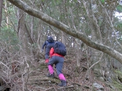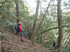 | 人気の山、通路は木の根が浮き出し注意しないとよく滑る。尾根から谷に下る地点にはこれでもかの目印がある 山肌に出来た踏み跡は立派な道だ。初めて登った時、踏み跡も不明瞭で、大きく間違った記憶がある |