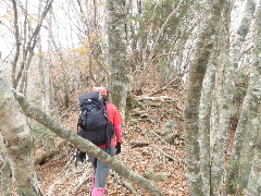 | 村立山からは尾根は完全自然林、二次林ではないのか巨木も多く尾根縦走としては面白い 各ピークピークでコンパスで方位をたしかめながら歩くが、よくにた地形もありP1074mと次の北から東に向きを変えるピークとが非常に似通っている。 コースは曲がっているほど位置特定が簡単だ。スムーズに縦走が出来る タダ、東に向きを変える1070mのピークからは尾根が痩せだし、左手、北側が崖状態、注意が要る 紅葉は五葉モミジがこれでもかと真っ赤に染まり目を楽しませたくれる 途中に一ヶ所岩と言える岩稜が出る、私は直登で岩を登ってみたが、寺ちゃん、T女は巻道を見つけ巻登った 動物も登っているとのことでした |