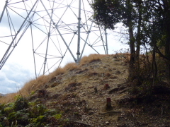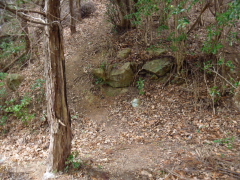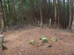 | ここから尾根はクネクネ曲がっているが、ルートは関電鉄塔管理道ルンルン小道で楽しい 地図の波線道を確認しながら歩く 先ず小城山を地図で確定した 管理道に入り すぐに尾根を越える古道が出る この古道は南側がハッキリと残っていた 掘割り南側に鉄塔道標があるこれに沿って登るともうルンルン 猪谷から登る波線道は残っていた 途中の四等点 後少しで熊野古道という所のピークに古刹の跡があり、熊野古道の雰囲気がプンプンと出る 法華壇跡 |