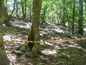 | トロッコ道に出ればその跡は濃いが安易な気持ちで入ると迷いが起こるだろう 位置特定が難しい大台ケ原トロッコ道、テープ等は無くまた景観の意味から余り好ましくないだろう 大台ケ原開発時代の遺物がトロッコ道周辺には多い 今回もあのワインと言えば赤玉ポートワインの空き瓶が落ちていた。 サントリーのワイン研究室に席を置いたことのある山姥は懐かしそうだ 前回の探索時に有った枕木の残り二本も無事だった ![]() 地図読みは山姥に任せ、購入したての虫除けシャツと虫除けハットの効果を試すショウタンだ 以前見た枕木を確認して歩くと、トラロープが張られた尾鷲道との出会いに出る ![]() 出会いの先が広いタオの白サコだ ここに、加筆された右古道が出るが、これは少し??物で、現在国土地理院最新地図を読めば、古道は1414mを越えてゆく 私は、これがトロッコ道と見ているが、今は尾鷲道として地倉山やマブシ嶺(コブシ嶺)に向かう登山道として使われている 地図で古道を歩くと尾根越えだ。最近はマークが出来随分と歩きよくなっている 白サコから入ってみると良いだろう。 兎に角、右手のトロッコ道と思うショウタン的トロッコ道を歩く。 ![]() 尾根と出会う広いタオに巨大な倒木がある所から、トロッコ道は尾根を巻くのだろうと、此処で探索を心見るが、これが間違いらしくその跡は無い。 ![]() 前回の経験から1414mピーク方面に登り返し、小さな堀割からトロッコ道が有る事を知る私は再度トロッコ道へと入る ![]() 十年か前に自分がつけたマークは未だ残っていた。 やはり此処がトロッコ道だが、コブシ嶺に向かう道も略トロッコ道の跡が一部有るだろう 軌跡からお分かりだろうが、堀割とコブシ嶺への道の標高差が気に成る 今この記事を書くに当たって、ルートが分かれていたのだろうか、それともトロッコ道を外したのか?? 探索軌跡を参考にしてください ![]() |