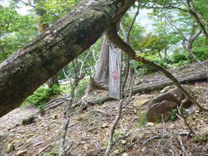 風通しの良いコルでお昼を楽しむ、谷に上がるガスはミストと成り涼しく、眠気を誘う![]() 少しでも近道を歩くスケベなショウタンは尾根には出ない モウいいだろうと尾根に乗る。 小さな岩横を巻いたり通ったり、マークは有るが古いものだ ![]() |