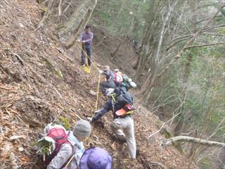 | 牛抱峠には健脚の梶野氏が先に着いていた。 斜面には僅かに道跡が有ると言うが、私にはとてもあのように早く歩くことは出来ない ここで記念写真だ ![]() ここまでは厳しいと言えば厳しいが、ここからはさらに厳しく、地形図コースはほぼ崩落してそれは無いが、道に準じてウリネ谷にくだる このトラバースはほぼ問題は無い ![]() ここから経験済みのリーダーと梶野氏がルートを指示してくれるが、急傾斜もいいところだ ![]() 放置されたネットが出てそれに準じる 14人も通れば道が痛みとうとうフィックスを貼る羽目になった 女性会員が必死に滑りをこらえていた ![]() ![]() |